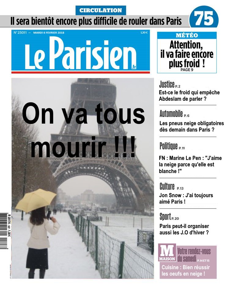 Bon, c'est ridicule, Paris va à nouveau être la risée de la France, en bas de chez ouam, quasiment le point le plus chaud de la capitale (à divers titres), il y a 5 cm de neige, qui fond tranquillement. S'il regèle sérieusement cette nuit, demain matin c'est la patinoire, on peut déjà prévoir 500 Parisiens aux urgences avec un col du fémur à refaire. Du haut de ces 5 cm, 40 000 55 000 fonctionnaires, relaxés par leurs 55 jours de congé annuels, nous contemplent, les bras ballants.