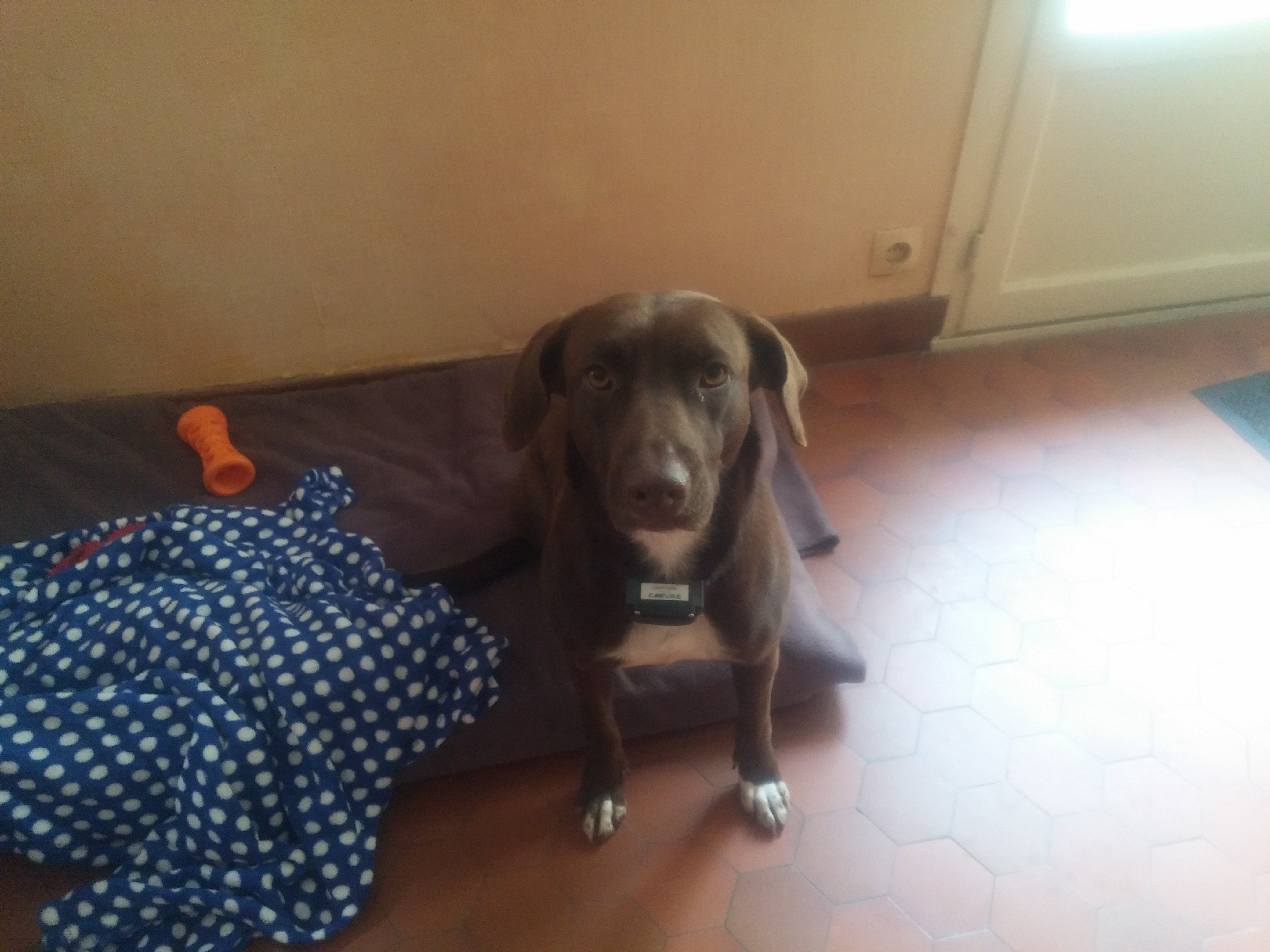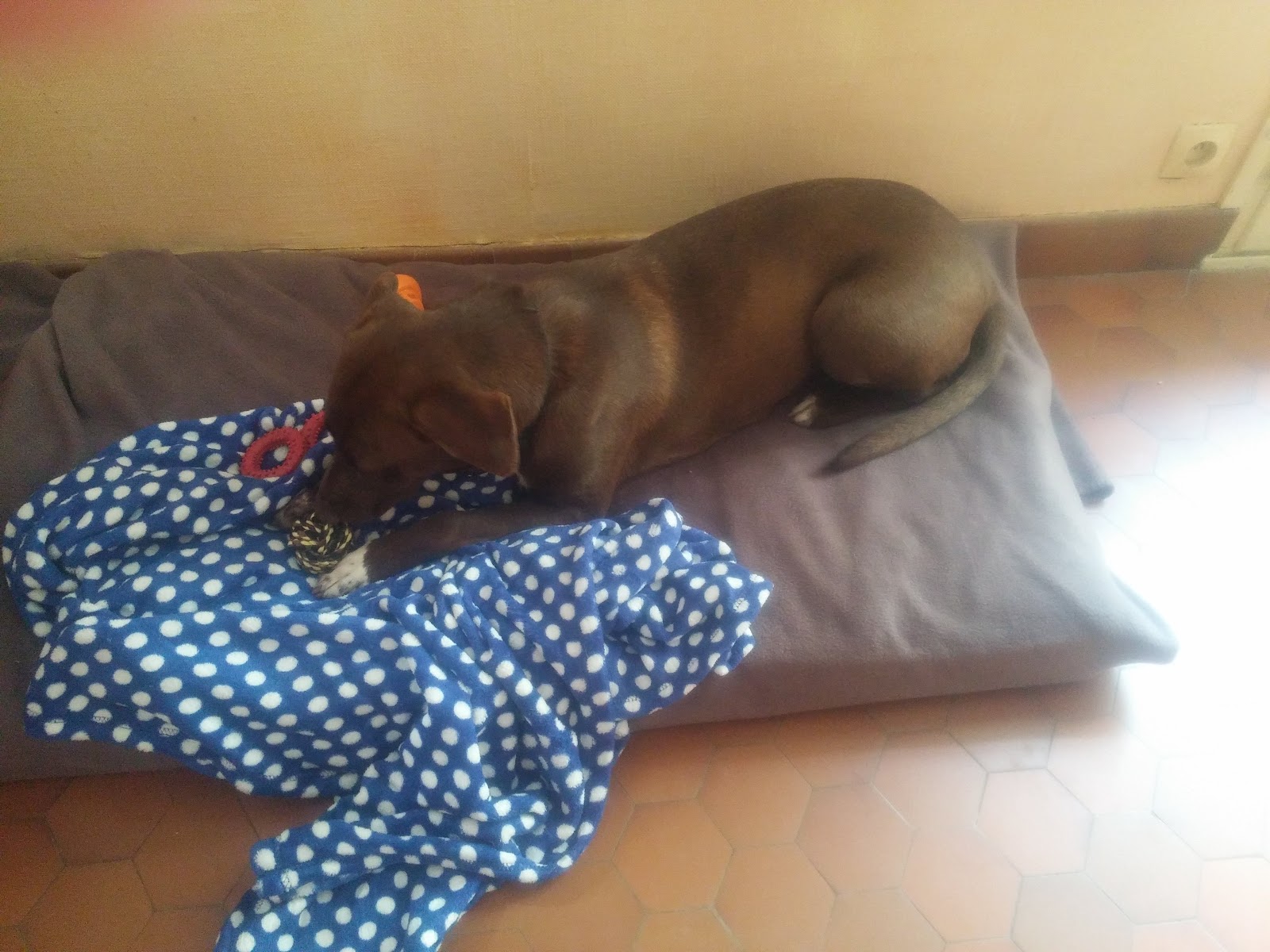 Elle m'arrive à mi-cuisse. Son épaule est au niveau de mon genou. Son copain de cellule au refuge m'arrivait au dessus de la hanche. Je suis désolé pour lui, parce qu'un chien aussi gros, ça doit pas s'adopter tous les jours ... pourtant il était sympa comme tout.