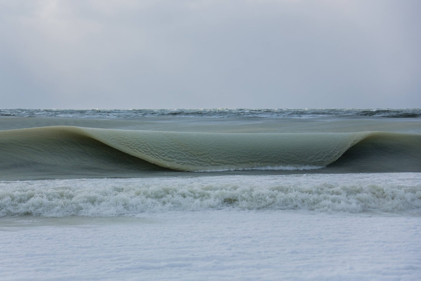 Bon la Baskie, vu d'ici vous êtes en plein dans les inondations, les avalanches et les vagues-submersion simultanément. En vrai ça donne quoi ? Ci-dessous une vague prise au large de Nantucket, USA, par une température de -10°C. La surface de la mer est composée de "slus"h, la glace pilée qui se forme sans s'agglomérer parce qu'il y a trop de vent.